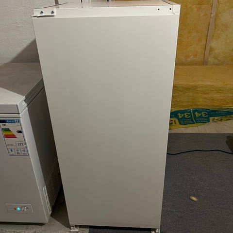 Frittstående kjøleskap egnet for bruk på kjøkken, bod eller lignende. Standard hvit front og håndtak nederst på døren. Passer til oppbevaring av mat- og drikkevarer i husholdning.