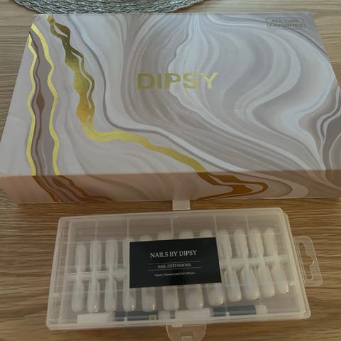 Dipsy neglesett med dip powder og tilbehør. Settet inneholder flere små beholdere med farget pulver, flasker med base, aktivator og top coat, samt verktøy som applikatorer og fil. Egnet til hjemmebruk for å legge dip powder-neglebehandling. Leveres i original eske med formskåret innredning for produktene.