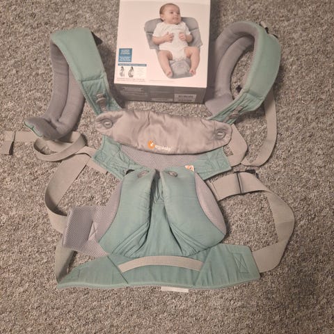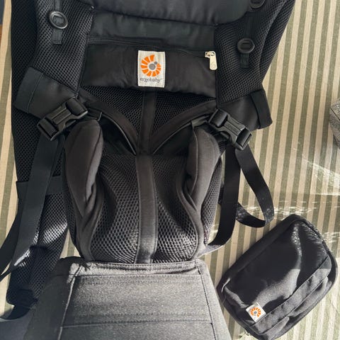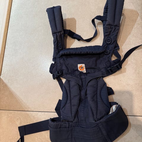 Selger en Ergobaby Omni 360 bæresele i svart😊 Bæreselen har polstrede skulderstropper og bred, justerbar hoftereim med støtte for korsryggen. Den kan tilpasses ulike livvidder, med markeringer på beltet for minimums- og maksimumsmål.