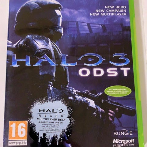 Halo 3 ODST Xbox 360 spill. Actionspill i Halo-serien til Xbox 360. Spillet leveres i original eske med plate og manual, og har aldersgrense 16 år. Støtter både enspillermodus med kampanje og flerspillermodus over Xbox Live, som vist på omslaget. Tekst og informasjon på baksiden er blant annet på norsk, svensk og finsk.
