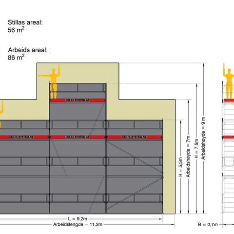 Stillasen er bygget med solide materialer og er bygget slik at den kan enkelt tas sammen og fra hverandre med hjelp av 10 bolter som kobler alt sammen