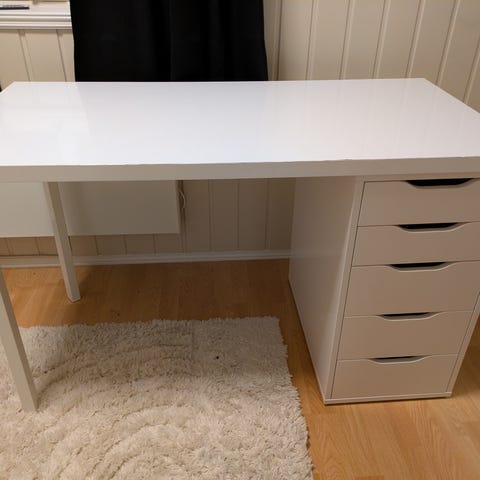 Stort skrivebord med 5 skuffer. To ganske synlige merker men dekkes lett om man putter noe oppå de.