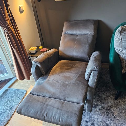 Elektrisk lenestol som kan heises høyt så det er lettere å komme ut av.
