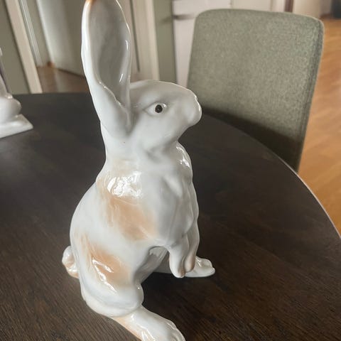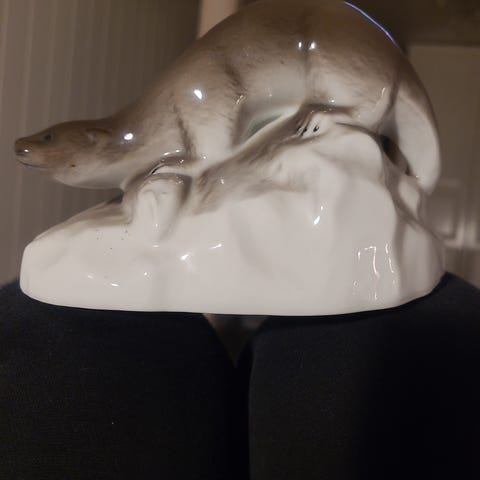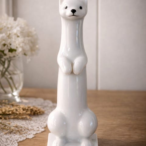 Porsgrund Tor Vaa porselensfigur i hvit glasert utførelse. Figuren har stilisert dyreform og står på rektangulær sokkel. Undersiden er merket med Tor Vaa og Porsgrunds Porselænsfabrik. Egner seg som dekorativ gjenstand i interiør, for eksempel på hylle, skjenk eller bord.
