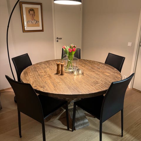 ⚠️ Merk: En stol har litt slitasje under setet (på undersiden). Dette påvirker ikke bruk eller stabilitet, og synes ikke når stolen står normalt.