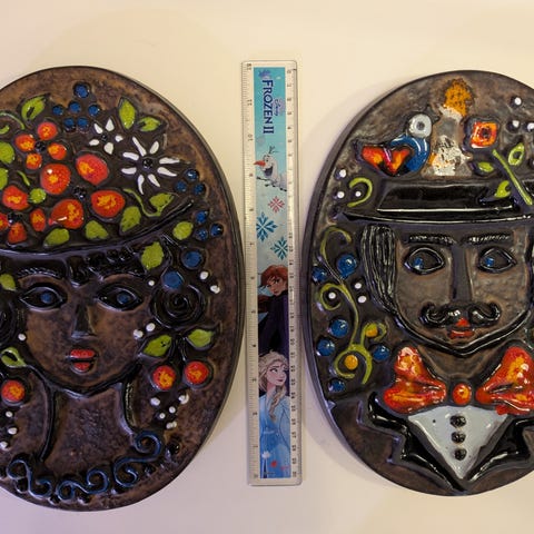 Flott veggplate i glasert keramikk fra Carstens Tönnieshof, modell 6191-22, produsert i Vest-Tyskland. Dekorert med fargerik blomsterbukett i relieff med rød, gul, blå og lilla glasur mot brun bakgrunn. Typisk 1960–70-talls West Germany design med kraftig glasur og markert struktur.