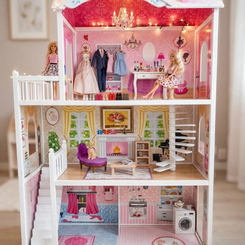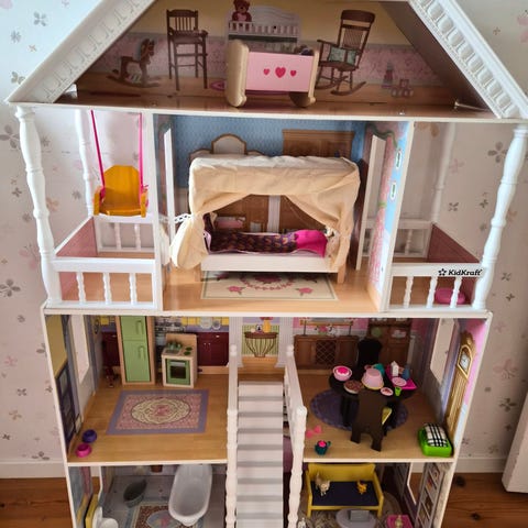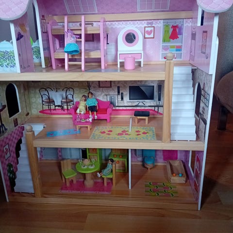 Kidkraft dukkehus med flere etasjer og møbler med 3 barbie