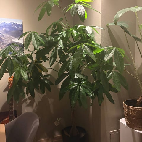 Grønn inneplante i potte med flettet kurv rundt. En del tørre blader. Leveres i potten som vist på bildet. Kan noen med grønne fingre redde denne?