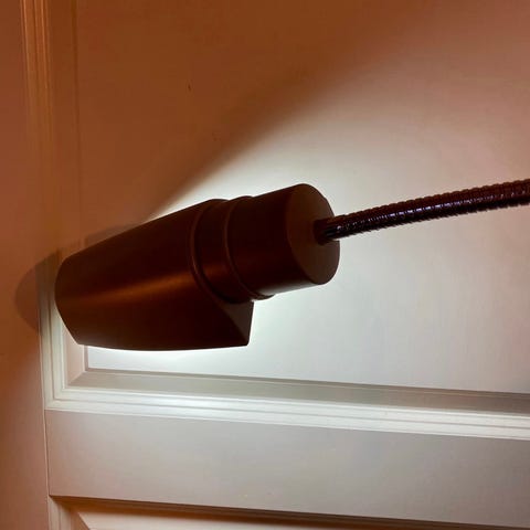 Stålampe som kan formes og justeres etter ønsket vinkel. +/- 160 cm høy når den er helt rett. Bryter til å tråkke/trykke på. Lang ledning.