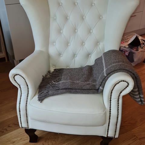 Selger 2 stk originale Laura Ashley ørelappstoler i skinn, klassiske og svært komfortable lenestoler med tidløst engelsk design.