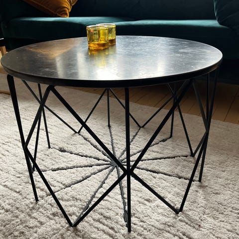Rundt sofabord med bordplate i hamret kobber og sort metallunderstell.