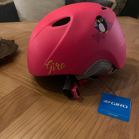 Giro Sting barnehjelm. Strl XS'/s 49-52 cm. Bruksmerker, og mangler feste til skibriller bak. Ellers i god stand