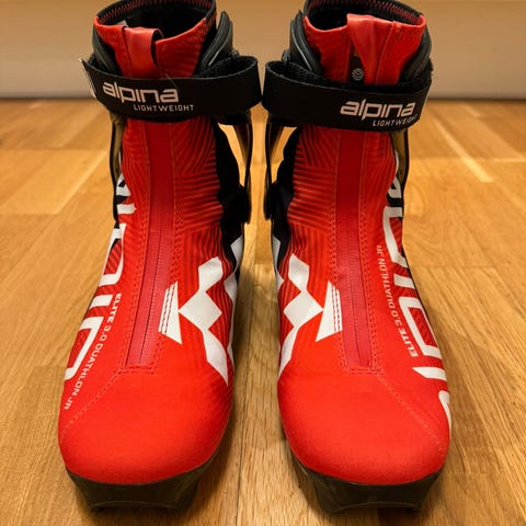 Alpina Pro Skate skisko i rød og svart farge. Skiskoene er beregnet for skøyting og har høy ankelstøtte med plastmansjett for bedre stabilitet. Overdelen har glidelås og snøring som beskytter og gir god tilpasning rundt foten. Såle og hælkappe er laget for å gi god kraftoverføring til skiene. Brukt 3 turer, selges fordi de ble for smale over rista.