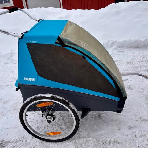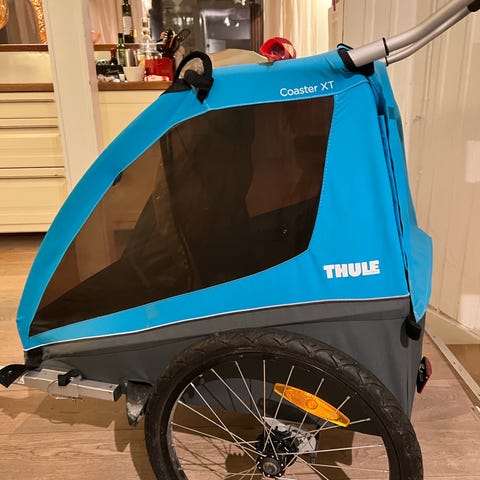 Thule sykkelvogn i turkis farge. Vognen har plass til to barn med separate seler og polstrede seter. Fronten har gjennomsiktig overtrekk som beskytter mot vær og vind, samt nettingpaneler på sidene for lufting. Store hjul bak gir stabilitet under sykling, og det medfølgende lille forhjulet foran gjør at vognen også kan brukes som trille på korte turer til fots. Egnet for transport av barn bak sykkel på vei og gangsti, samt som barnevogntralle i nærområdet.