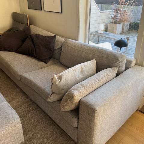 Sofaen har god sittekomfort med romslige puter og solid utførelse. Det er noe kloremerker på høyre side som er synlige ved nærmere ettersyn. I tillegg er det et hull under sofaen, dette er ikke synlig i bruk og påvirker verken funksjon eller komfort.