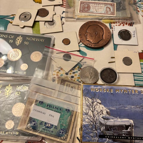 3,65kg mynter og sedler selges for 1000kr evt høystbydende over ved flere interreserte.