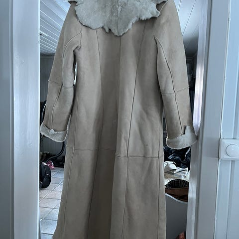 Tynn og mykt saueskinn. Kort kåpe. Enkeltspent. Mørk brun.