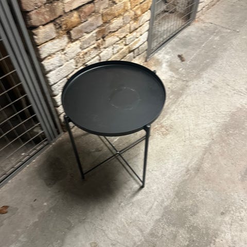 Rundt bord i svart metall. Bordet har enkel, rund bordplate og tre bein. Egnet som lite sidebord eller avlastningsbord innendørs eller på overbygd uteplass, avhengig av materiale og behandling. Størrelse og produsent er ikke oppgitt.