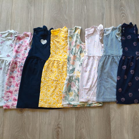 En del er veldig pent brukt eller ubrukt (kjoler, lys sett med shorts, frotté dress), en del er godt brukt (ingen hull, men har flekker). Kan godt brukes i barnehage:)
