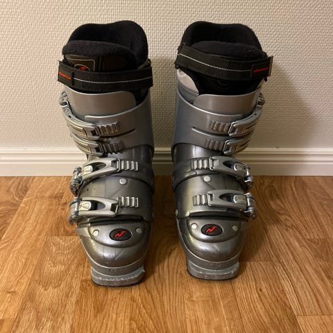 Nordica Dobermann X5 alpinstøvler i grå farge. Støvlene har fire justerbare spenner og powerstrap øverst for bedre tilpasning rundt leggen. På sålen er de merket med størrelse 270–275 mm, og sålelengden er 315 mm. Innvendig har støvlene polstret og tekstiltrukket innerstøvel for økt komfort. Egner seg til bruk i alpinbakke med vanlige alpinbindinger.