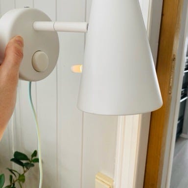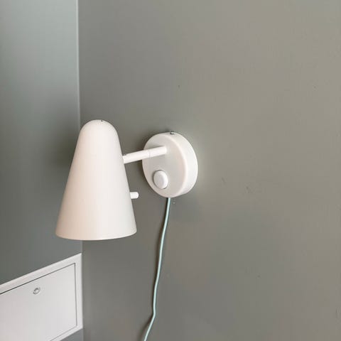 Hvit vegglampe med pære. Ledningen er to meter lang. Selges grunnet planlagt flytting. Den har kun hengt i et rom som var til bruk som hjemmekontor en kort periode, og er i god stand. Nypris var 1.399,-.