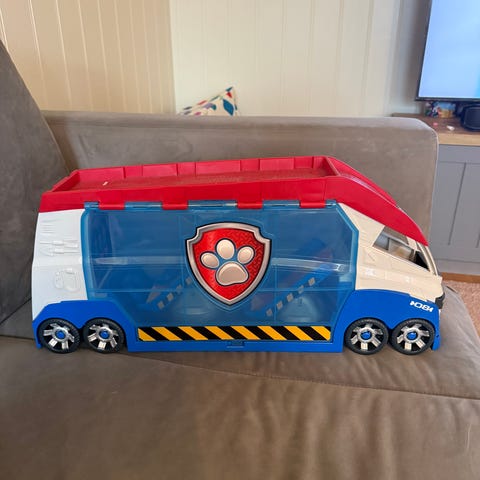 Paw Patroler. Sidene kan åpnes og danner ramper. Utsiden er dekorert med Paw Patrol-merker langs siden. Egnet som kjøretøy og oppbevaring for små figurer og biler fra samme serie eller lignende leker.