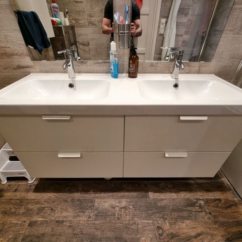 Baderomsinnredning med dobbel servant i hvit topp og fronter i treimitasjon. Underdelen har fire skuffer med rette håndtak i metallfarge for oppbevaring av baderomsartikler. Servanten har to separate vaskebasseng og er egnet for montering på vegg på bad. Passer i baderom med flislagte vegger og standard rør- og avløpstilkobling.