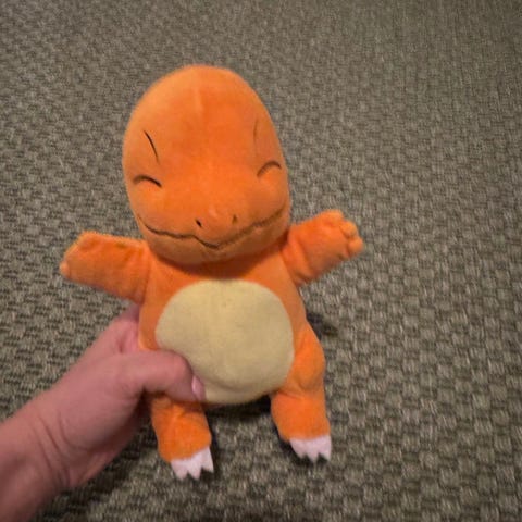 Pokémon Pikachu og Rowlet kosedyr med tilhørende pokéballer.