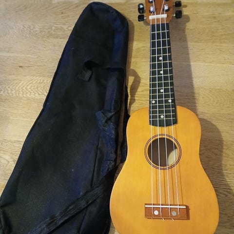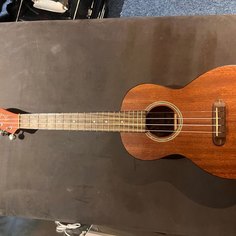 Kahuna ukulele akustisk i brun finish. Instrumentet har fire strenger og tradisjonell ukulele-kropp med rund lydhull. Hals og gripebrett er utformet for enkel spilling, og stemmeskruene er åpne med hvite stemmeknapper. Leveres med enkel bærebag som gir grunnleggende beskyttelse ved oppbevaring og transport. Egner seg til akustisk spilling hjemme, på øving eller til bruk i undervisning.
