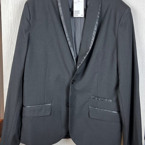H&M blazer for herre i størrelse M. Blazeren er blå og har klassisk fasong med slag og to frontlommer. Den har kontrastfargede albuelapper på ermene. Passer til bruk ved både formelle og uformelle anledninger, for eksempel til bukse eller jeans.