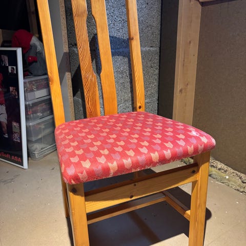 Klassisk og solid spisestuestol i lyst heltre (trolig furu) med polstret sete i rød- og hvitstripet stoff.