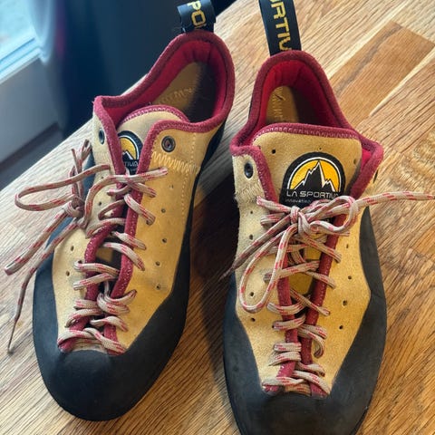 La Sportiva klatresko med snøring i størrelse 44. Skoene har overdel i tekstil og syntetisk materiale med gule og svarte felt. Yttersålen er i gummi, utformet for presisjon på små tak. Hælhemper gjør det enklere å ta skoene av og på. Passer til innendørs og utendørs klatring der det er behov for tettsittende klatresko med snøring for justerbar passform.