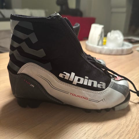 Alpina Sport langrennsstøvler i svart, grå og gul farge til barn (lengde 20 cm ~ str. 31). Støvlene har glidelåslukking foran som dekker lissesystemet, og en høyere mansjett rundt ankelen for ekstra støtte og beskyttelse mot snø. Sålen er tilpasset klassisk langrenn med profil for binding. Overdelen er i syntetisk materiale med forsterket tå- og hælparti for bedre slitestyrke.