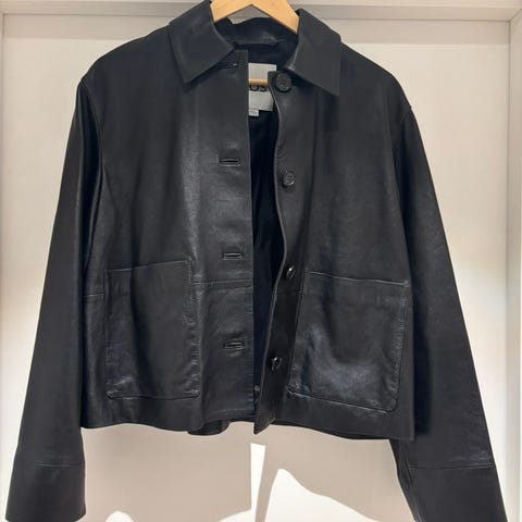 Tidsriktig, og skikkelig kul semsket skinnjakke i str 40, i nydelig brun med flotte detaljer rundt skuldrene, trekte knapper og glidelås foran.