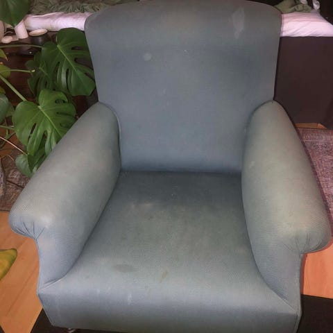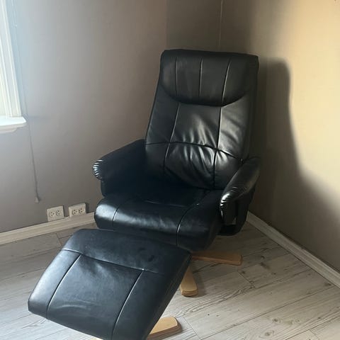 2 eldre lenestoler med puff. Gode å sitte i, en er knekt i det ene armlene. Går nok Ann å fikse, har bare ikke giddet det…