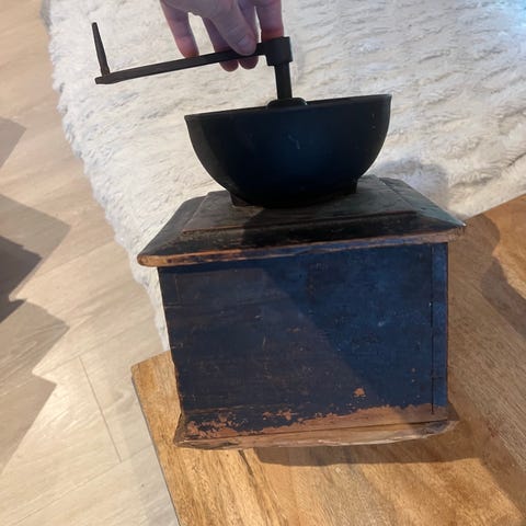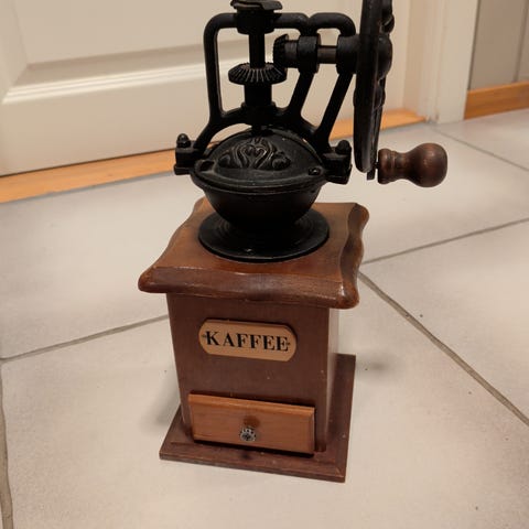 Manuell kaffekvern i klassisk design. Kvernen har hus i brunt treverk med fire søyler og glassbeholder i midten. På toppen er det en metallkuppel med sveiv og trehåndtak for manuell maling av kaffebønner. Nede i kvernen er det en uttrekkbar skuff i tre for oppsamling av malt kaffe. Egnet til maling av hele kaffebønner for bruk i ulike bryggemetoder.