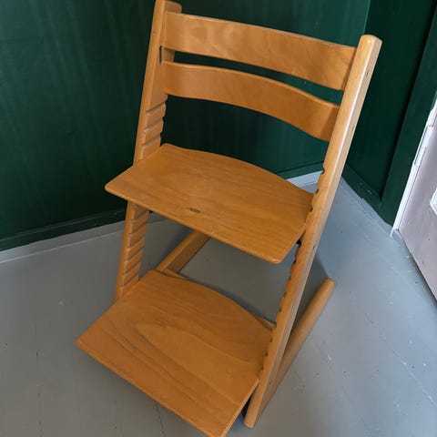 Stokke Tripp Trapp høy barnestol i oransje lakkert tre. Meget pent brukt, med gå skrammer. Stolen har justerbar sitteplate og fotbrett som kan flyttes i høyden etter behov. Klassisk Tripp Trapp-konstruksjon med sidestykker i tre og tverrstag for stabilitet. Egnet som barnestol ved spisebord eller arbeidsbord, og kan tilpasses barn i ulike aldre ved å regulere høyden på sete og fotbrett.