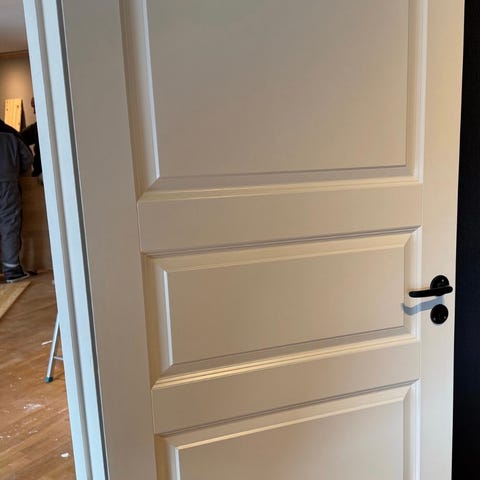 Innerdør uten terskel i hvit utførelse. Døren har klassisk profil med tre fyllinger og leveres med dørhåndtak og låskasse montert. Mål på dørblad er ca. 80 x 210 cm. Egnet som innvendig dør mellom rom i bolig eller kontor.