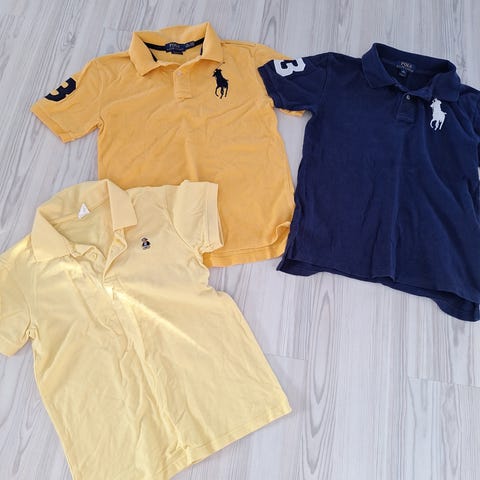 3 stk Polo Ralph Lauren t-skjorte for barn i størrelse 7/8 år. Unisex-modell i bomull. Flere farger , t-skjorter som på bildet, med karakteristisk Polo Ralph Lauren-logo på brystet og/eller erme.