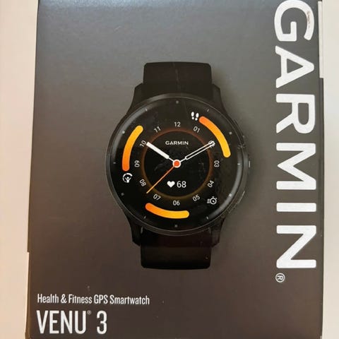 Garmin Venu 3 smartklokke i fargen svart. Klokken leveres med original eske og en ekstra utskiftbar reim i oransje.