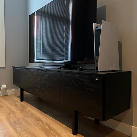 Selger svart Bestå TV benk med glassplate. Den har to skap og en skuff + hylle.