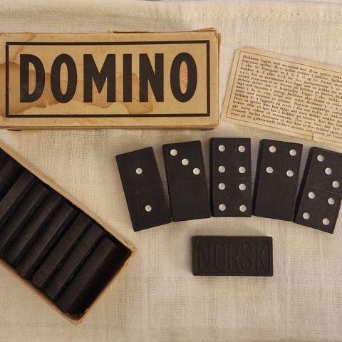 Hvert sett består av 28 rektangulære brikker i tre i mørk farge, med innfelte prikker i flere farger for enkel identifisering av tallverdier. Baksiden av brikkene har preget motiv.