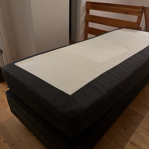 Jensen rammemadrass enkeltseng i hvit tekstil. Madrassen er bygget inn i en fast ramme med treben/bøyleunderstell i tre, som gir stabil støtte. Overflaten har et lyst trekk med Jensen-logo. Passer som enkeltseng på soverom, gjesterom eller hybel. Størrelse 90 cm bred og 200 cm lang.