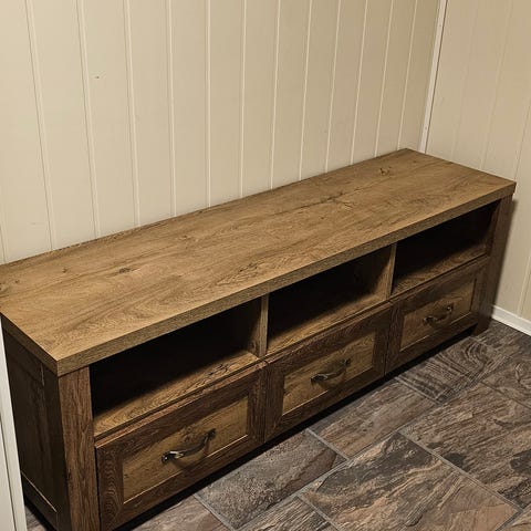 Selger svart blank tv benk med 2 skap skuffe på begge ender og 3 hylle skap i midten. Grei og god benk.
