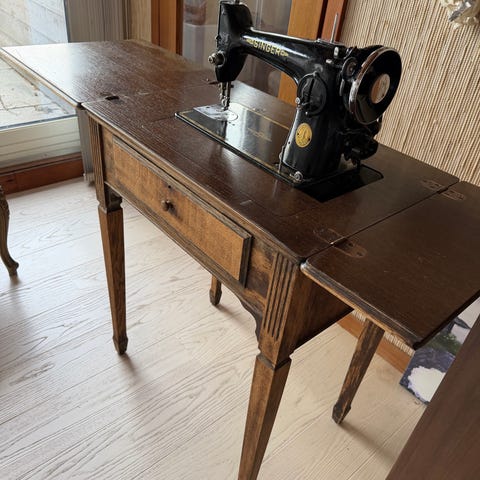 Singer industrielt symaskinbord med metallunderstell og bordplate i tre. Bordet er tilpasset innfelling av symaskin og har utsparing i platen for maskin og arbeidsflate. Understellet er i støpejern med Singer-logo på siden. Bordet har en uttrekksskuff med diverse sytilbehør som nåler, spoler og smådeler, slik det fremgår av bildene. Egnet som arbeidsbord for industriell eller halvindustriell symaskin, eller som understell til eksisterende Singer-maskin.