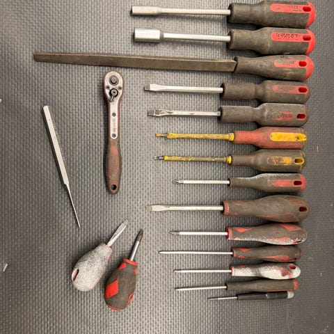 Utvalg kvalitetsverktøy fra Teng Tools. Inneholder to 17 mm skralle-/kombinasjonsnøkler (6005 17R), 13 mm kombinasjonsnøkler, 1/2” kombinasjonsnøkkel (600116), forlengere med ledd samt piper i bl.a. 10 mm, 13 mm (kort og lang) og 19 mm. Alt er merket Teng Tools.