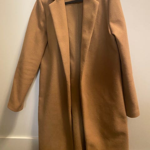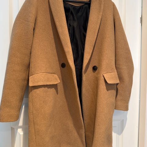 Zara kåpe for dame i størrelse S. Kåpen er beige og laget i polyester. Modellen har klassisk krage, én knapp i front og klafflommer. Baksiden har splitt nederst for bedre bevegelse. Innsiden er helfôret for økt komfort. Egnet som yttertøy i overgangssesonger og milde vinterdager.