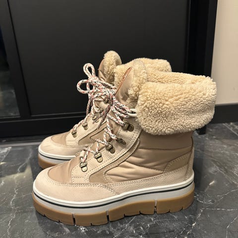 Støvlene er høye med snøring foran og grov såle. Farge svart med lys sålekant. Overdelen har vattert/quiltepreget utside, og innsiden ser ut til å være fôret for ekstra varme. Egnet som vinterfottøy i kaldt og vått vær.