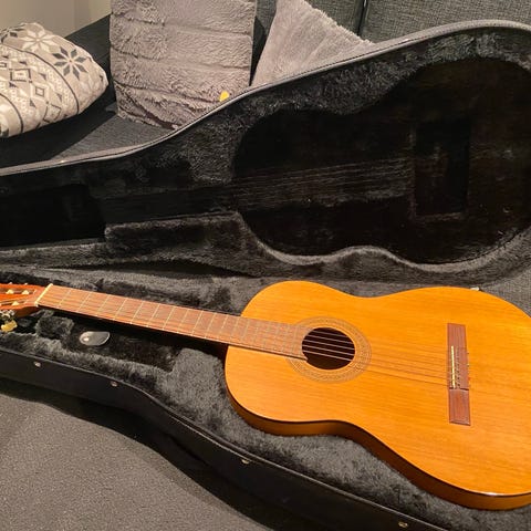 Stagg akustisk gitar i naturlig tre. Denne gitaren har en klassisk design med en lys treoverflate. Den er utstyrt med seks strenger og har stemmeskruer i metall for enkel justering. Veldig fin gitar.