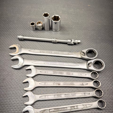 Selger et parti originale HEYCO piper i ulike dimensjoner, inkludert både korte og lange varianter, samt kraftig buet ringnøkkel (HEYCO No. 430). Alt er merketøy og i solid stål. Brukt med normale bruksmerker, men fremstår som fullt brukbart.